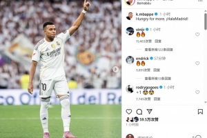 姆巴佩本场比赛打入一球,他写道:“渴望更多,Hala Madrid!”
