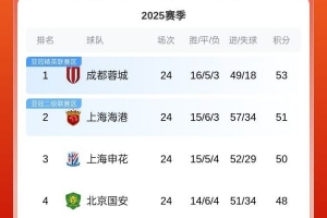 目前成都蓉城积53分居榜首,上海海港积51分位列次席,上海申花积50分排第三,北京国安积48分排第四。