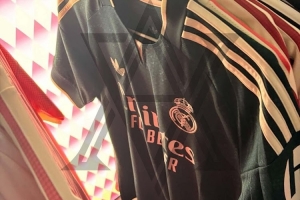这件阿迪达斯皇马2026-27赛季客场球衣的泄露图似乎来自一家商店或发布会现场,衣架上可见多件球衣,其中也包括皇马26-27赛季的粉色第三球衣。