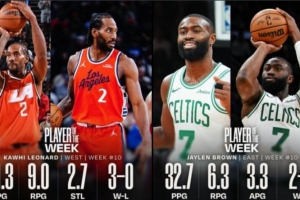 体育资讯12月30日讯 今日NBA官方宣布,杰伦·布朗与小卡分列上周东西部最佳球员。