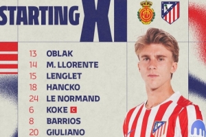 马竞首发:13-奥布拉克、14-马科斯-略伦特、15-朗格莱、18-汉茨科、24-勒诺尔芒、6-科克、8-巴勃罗-巴里奥斯、20-朱利亚诺-西蒙尼、23-尼古拉斯-冈萨雷斯、19-阿尔瓦雷斯、22-拉斯帕多里