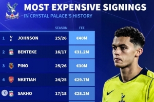 体育资讯1月3日讯 水晶宫已经官宣签下热刺边锋布伦南·约翰逊,《转会市场》统计显示他也是水晶宫队史最贵新援。