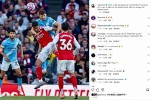 曼城球员鲁本-迪亚斯也在社媒晒出本场照片,配文写道:“为今天全队的拼搏精神感到骄傲,很失望没能拿到3分,我们带着能量与斗争精神继续前进!”
