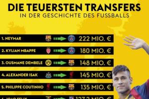 全文摘要:德天空公布夏窗后足坛历史转会费榜,内马尔以2.22亿欧居首,姆巴佩、登贝佩紧随其后。夏窗新援伊萨克(1.45亿欧)和维尔茨(1.25亿欧)分列第四和第八。