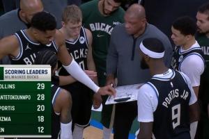回顾当时的场景,小凯文·波特表示:“老里当时正设计战术,扬尼斯觉得换防太多了,于是他就给我们画了那个战术,我们执行了。”