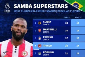 英超历史单赛季巴西射手榜: