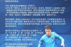 张煜东致深圳球迷的一封信:今日,我向深圳新鹏城道别。