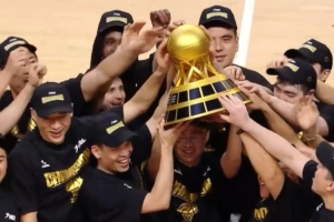 荣耀瞬间!香港金牛篮球俱乐部大比分3-1战胜长沙勇胜,NBL联赛两连冠,球队捧杯庆祝夺冠。