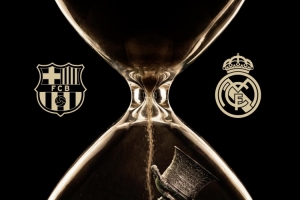 巴萨官方社媒晒出西超杯决赛海报,预热与皇马的国家德比,海报内容为沙漏+西超杯奖杯,两队的队徽分居沙漏两侧。