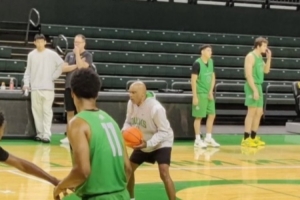 体育资讯9月23日讯 有俄勒冈大学篮球队粉丝发布了一张球队在主场球馆训练的照片,从照片中可以看到除了在训练的队员之外,场边还站着穿着便装的林葳。