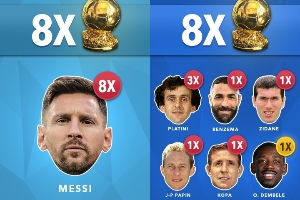 1.法国 8次(普拉蒂尼x3 本泽马、齐达内、帕潘、科帕、登贝莱x1)