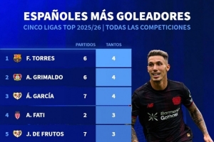 全文摘要:五大联赛西班牙球员进球榜出炉,费兰-托雷斯、格里马尔多与阿尔瓦罗-加西亚以4球并列榜首。法蒂表现抢眼,2场贡献3球。榜单展现了西班牙球员在本赛季的出色进攻火力,多位球员跻身前列。