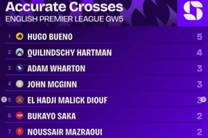 英超第5轮精准传中榜: