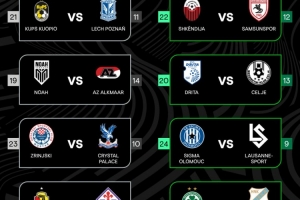 全文摘要:欧足联公布欧协联淘汰赛附加赛对阵。乔治罗尼亚将对阵佛罗伦萨,水晶宫则迎战日林斯基。其他对阵还包括库普斯对波兹南莱赫、诺亚FC对阿尔克马尔等,共计八场对决。
