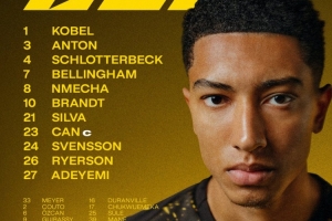 1-科贝尔、3-安东、4-施洛特贝克、7-小贝林厄姆、8-恩梅查、10-布兰特、21-法比奥·席尔瓦、23-埃姆雷·詹、24-斯文松、26-莱尔森、27-阿德耶米
