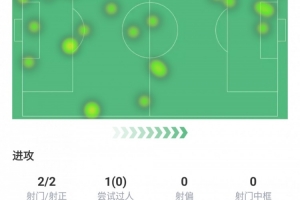 拦截1次、抢断2次、地面对抗10次成功5次、争顶3次成功2次、犯规1次、被犯规3次、被过1次。