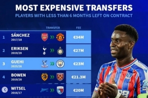 全文摘要:曼城以2300万欧元引进合同仅剩半年的水晶宫中卫格伊,使其成为德转统计的合同剩余不足半年球员转会费历史第3高。此前纪录由桑切斯(3400万)和埃里克森(2700万)保持。