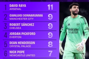 水晶宫门将迪恩·亨德森8次零封位列第五,纽卡门将波普、热刺门将维卡里奥以及桑德兰门将罗夫斯7次零封位列六至八位。