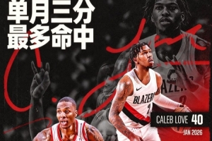 开拓者官微写道:“来看看乐福在一月的(40记)三分表现🔥 他在一月单月三分命中数排名开拓者队史新秀第二位,仅次于达米安·利拉德(42记)”