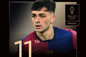 体育资讯09月27日讯 今日《法国足球》官方公布了金球奖评选的投票细节,其中西班牙/巴萨中场佩德里在100位记者中仅获得了31人的投票,最终获得124分,位列金球第11名,落后第10的努诺-门德斯47分。