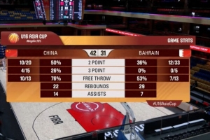 巴林男篮U16:阿卜杜勒卡迪尔16分8板、马沙伊6分3板1助、穆罕默德3分2板3助、阿博奇2分5板1助、阿卜杜拉2分1板1助、阿里·哈达德2分1板、马丹1板1助、哈比卜1板、古卢姆1板