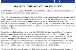 此外,印第安纳步行者队因在2月3日对阵犹他爵士队的比赛中违反球员参赛政策,被罚款10万美元。经联盟调查及独立医师复核,NBA认定该政策涵盖的明星球员帕斯卡尔·西亚卡姆及其他两位未登场的步行者首发球员,本可在政策规定的医疗标准下出战,包括采取缩减出场时间的方式。球队亦可选择让这些球员在其他场次轮休,以更合规的方式执行球员参赛政策。
