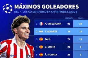 全文摘要:欧冠淘汰赛附加赛首回合,马竞客场3-3战平布鲁日,阿尔瓦雷斯点射破门。赛后更新了马竞队史欧冠射手榜,格列兹曼以91场39球高居榜首,阿尔瓦雷斯18场12球效率惊人,暂列第二。