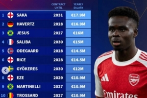 阿森纳队内年薪排名:萨卡以1790万欧元位列第一,哈弗茨紧随其后,热苏斯排名第三。