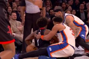 GIF-唐斯扑球 坐到了泰特的右膝 泰特受伤离场了……