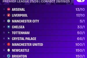 全文摘要:英超最新冠军赔率更新。阿森纳2-1逆转纽卡后,以13/10的赔率升至榜首,利物浦以17/10紧随其后。曼城以5/1位列第三,其他球队赔率则明显落后。