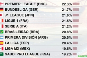 全文摘要:根据CIES数据,英超以22.3%的高速跑动距离占比位居全球联赛榜首,展现最高强度的比赛节奏。德甲(21.7%)与J联赛(21.6%)分列二、三位,而西甲仅排名第八(20.4%),凸显其风格差异。