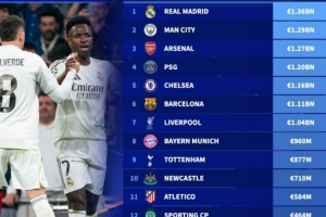 欧冠16强球员总身价排名:皇马领跑,曼城、阿森纳、巴黎、切尔西紧随其后位列前五