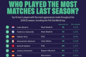 体育资讯9月29日讯 FIFPRO统计了上赛季球员出场排行,莫德里奇共出场76次居首,共4376分钟。