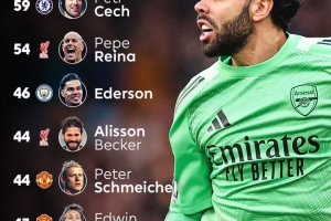 以下为英超历史前100场比赛门将零封榜:
