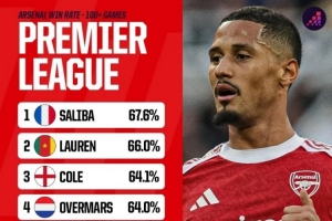 全文摘要:阿森纳中卫萨利巴在英超出场超100次的球员中胜率最高,达67.6%,已续约至2030年。他力压劳伦、科尔等名宿,位居队史胜率榜首,成为队史关键先生。