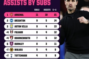 全文摘要:根据Opta统计,在2025/26赛季英超中,阿森纳替补球员表现最亮眼,贡献11球10助攻,总计21球,高居榜首。布莱顿以14球位列第二,维拉以13球紧随其后。