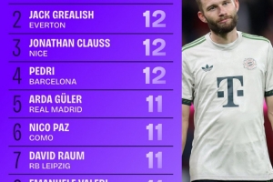 体育资讯10月1日讯 Squawka统计了欧洲五大联赛球员在9月份的创造机会次数榜单,拜仁中场莱默尔位列第一。