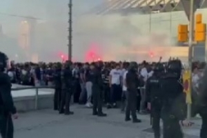 赛前,大批巴黎球迷在球场前聚集并呼喊口号。