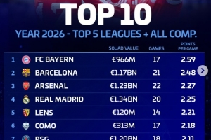 全文摘要:德转盘点了2026年五大联赛场均积分榜,拜仁以17场2.59分高居榜首,巴萨、阿森纳、皇马紧随其后。法甲球队朗斯表现亮眼,位列第五。巴黎、国米等传统强队也进入前十。