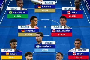 前锋:维尼修斯(1.7亿欧)、哈弗茨(6500万欧)、萨卡(1.5亿欧)
