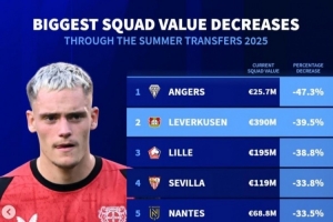 全文摘要:根据《转会市场》统计,法甲昂热以47.3%的身价降幅位居今夏榜首。德转发布的榜单显示,法甲共有7队跌入前十,包括勒沃库森、里尔和塞维利亚等队,整体身价普遍大幅缩水。