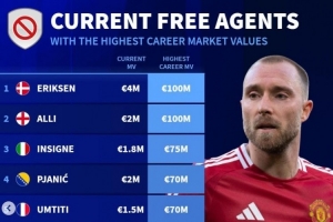 全文摘要:《转会市场》公布了夏窗关闭后自由身球员的历史身价榜。埃里克森与阿里以1亿欧元的生涯最高身价并列榜首,因西涅、皮亚尼奇等昔日名将也榜上有名。这份榜单反映了这些球星职业生涯的巅峰与现状。