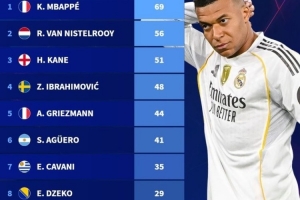 全文摘要:《转会市场》统计了未夺欧冠冠军的射手榜,姆巴佩以69球领跑,范尼56球、凯恩51分列二、三位。伊布、格列兹曼等名将也跻身前十,展现了顶尖球员在欧冠赛场的持久竞争力。