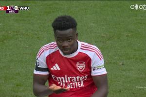 体育资讯10月04日讯 英超第7轮,阿森纳vs西汉姆联。比赛第60分钟,萨卡被对手打到脸部,鼻子出了点血。