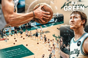 首节比赛中,AJ·格林命中3记三分,本赛季三分命中数来到230记,超越雷·阿伦(00-01赛季/299记)升至队史第一。