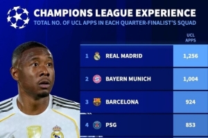 全文摘要:欧冠八强战开启,《转会市场》统计显示,皇马以1256场总欧冠出场次数居首,拜仁(1004场)、巴萨(924场)分列二三位。巴黎、马竞、利物浦、阿森纳和葡体依次排在四至八位。