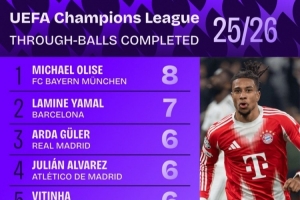 全文摘要:根据Squawka数据,本赛季欧冠成功直塞传球榜上,奥利塞以8次居首,亚马尔以7次紧随其后。居莱尔、阿尔瓦雷斯和维蒂尼亚均以6次并列第三,恩佐、福登等多名球员则以4次并列第四。