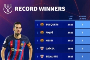 全文摘要:德国转会市场统计了球员国王杯夺冠次数。布斯克茨、皮克、梅西等5名球员以7次夺冠并列榜首。在前10名球员中,有8名来自巴塞罗那,凸显了该俱乐部在国王杯赛历史上的统治地位。