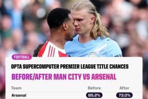体育资讯04月20日讯 曼城本轮2-1击败阿森纳,Opta超算赛后更新了英超夺冠概率,阿森纳在输给曼城后仍有73%。
