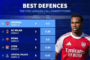 全文摘要:德国转会市场统计显示,本赛季五大联赛场均丢球最少的球队中,阿森纳以场均0.3球高居榜首,AC米兰以0.38球紧随其后。罗马(0.5球)、里昂(0.56球)和水晶宫(0.67球)分列三至五位,展现了各队出色的防守表现。